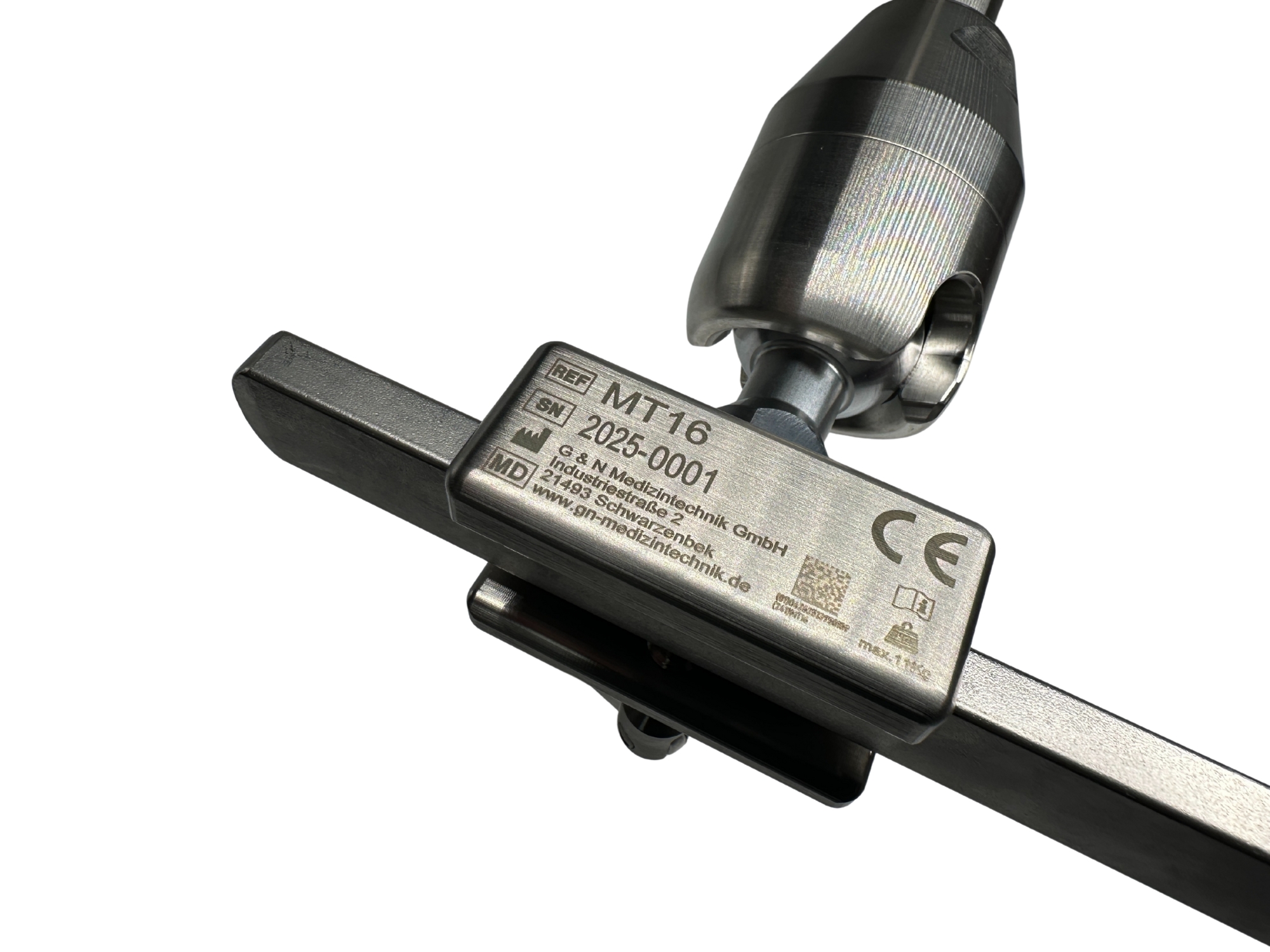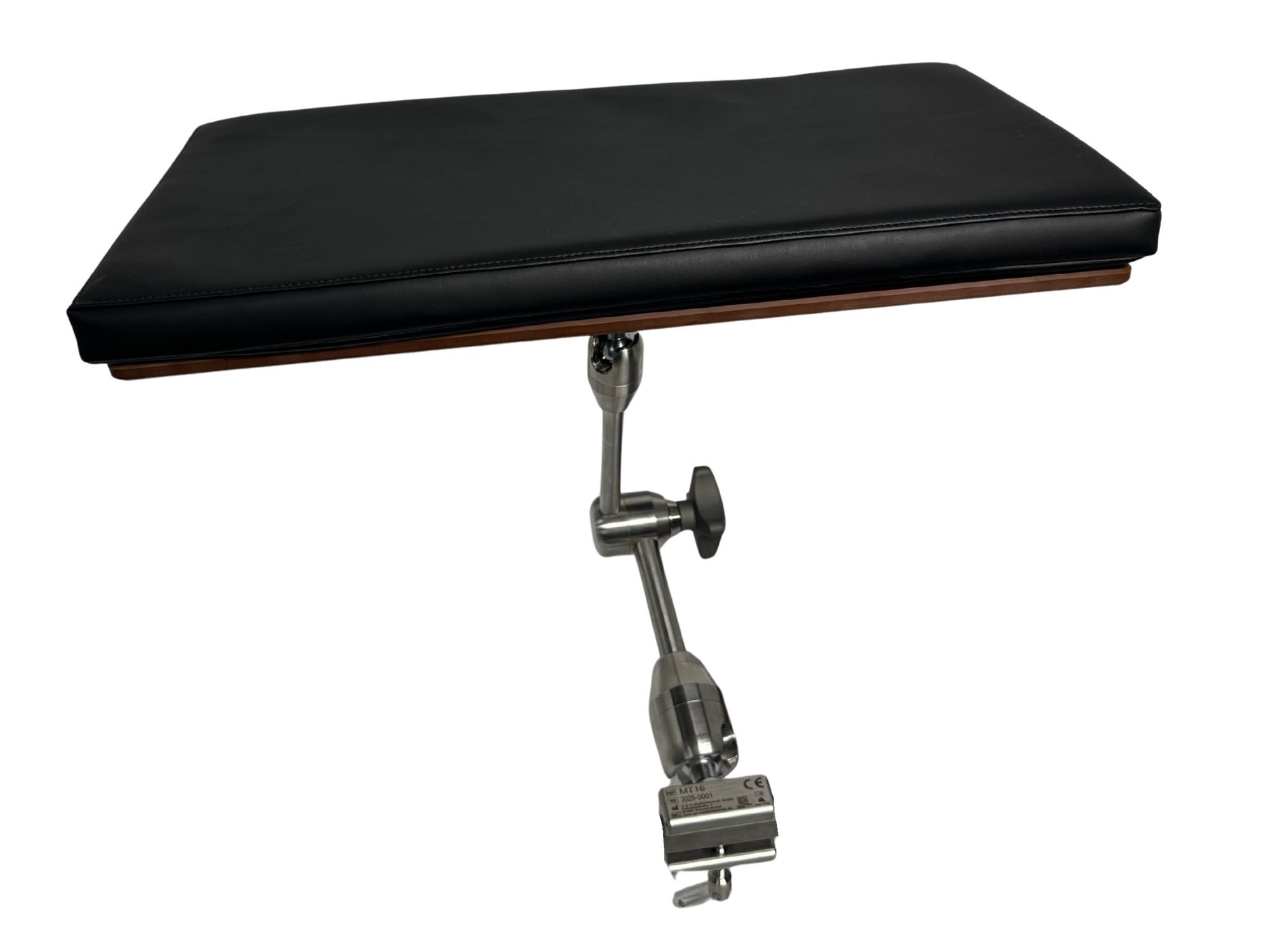 Unsere Armlagerung Hand OP-Tisch MT16 besteht aus unserem Gelenkarm mit zentraler Fixierung, einem Befestigungskloben mit Pendelfallknedel (MT110) zur Anbringung an allen OP-Tischen mit Normschiene 25x10mm, einem visko-elastischem Polster 550x310x30 (MT255) mit einer Länge von 550mm und einer Breite von 310mm und einer Polstergrundplatte 530×290 mit Flanschaufnahme (MT148) . Die Armlagerung dient der Lagerung des Patientenarms. Die maximale Belastbarkeit der Armlagerung beträgt in voll ausgestreckter Position 11 Kilogramm. Der Aktionsradius der Armlagerung beträgt circa 560mm und ist stufenlos verstellbar. Die Armlagerung ist aus Edelstahl gefertigt und durch ihre Bauweise und Materialwahl langlebig und stabil.